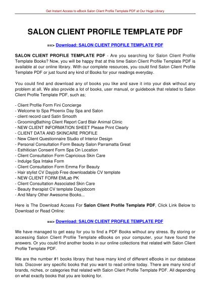 Download salon client profile template Ebook PDF online is a convenient and frugal way to read salon client profile template Ebook you love right from the comfort of your own home. Yes, there sites where you can get PDF "for free" but the ones listed below are clean from viruses and completely legal to use.
